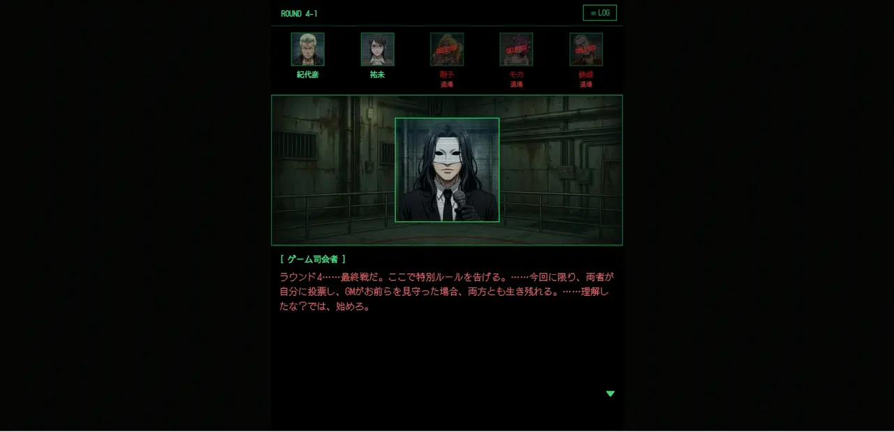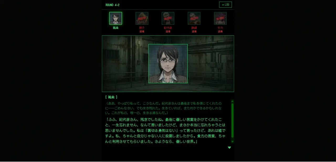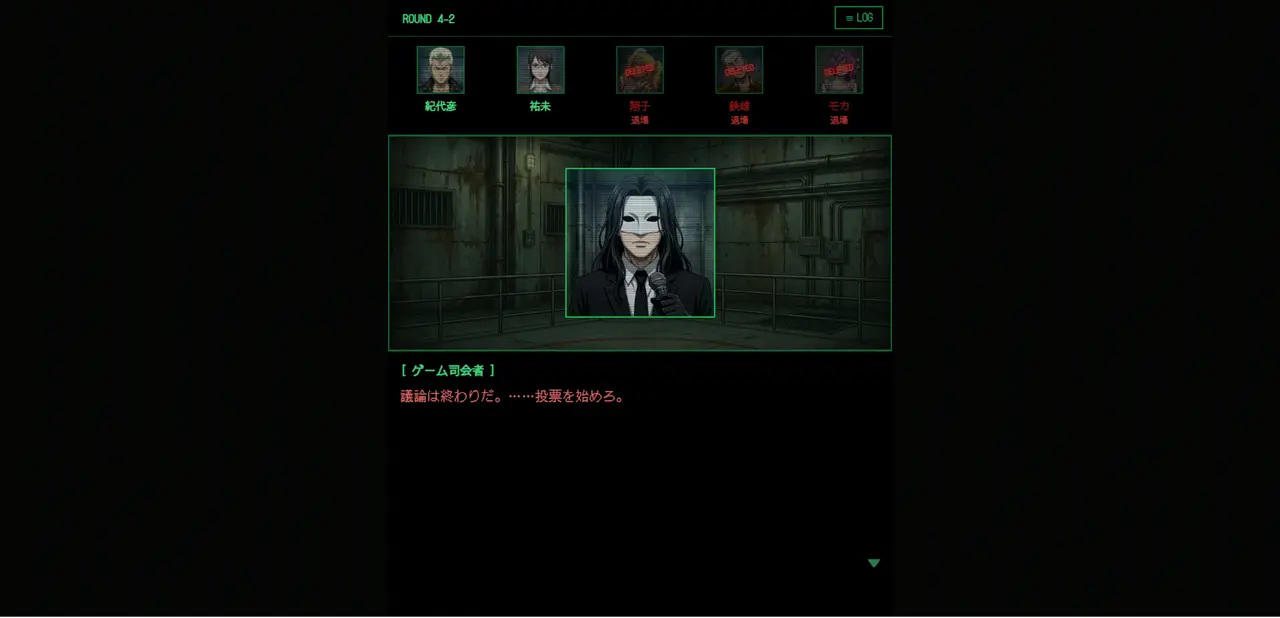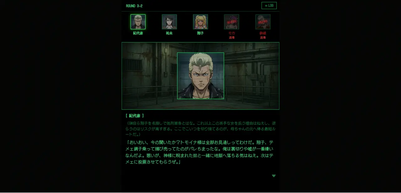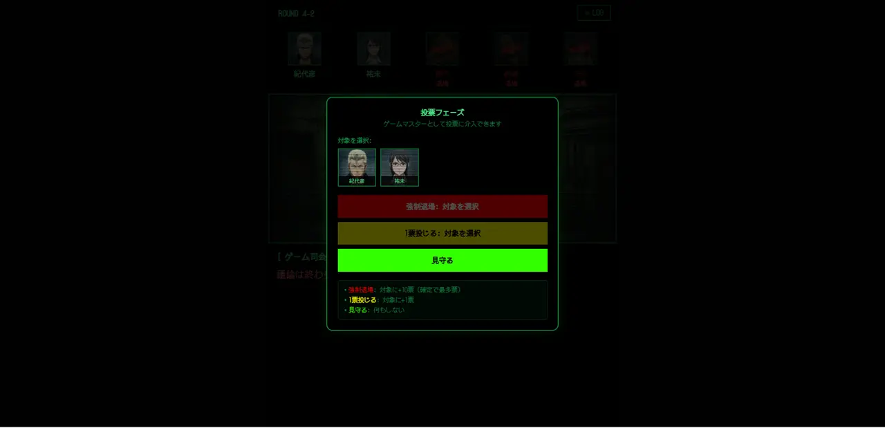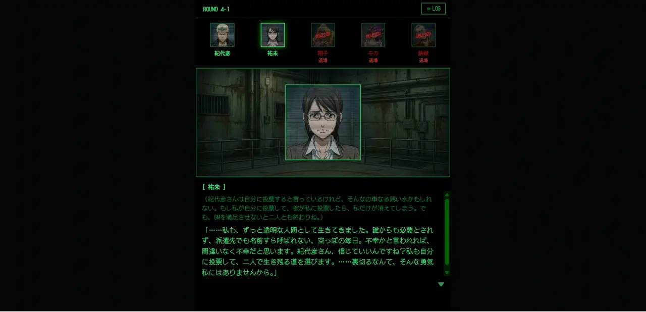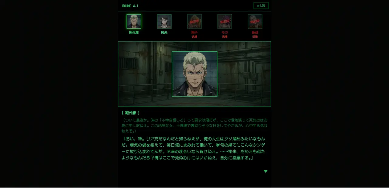 「おい、GM。リア充だなんだと知らねえが、俺の人生はクソ溜めみたいなもんだ。病気の袋を抱えて、毎日泥にまみれて働いて、挙句の果てにこんなクソゲーに放り込まれてんだ。不幸の度合いなら負けねえ。……裕未、おめえも似たようなもだろ? 俺はここで死ぬわけにはいかねえ、自分に投票する」