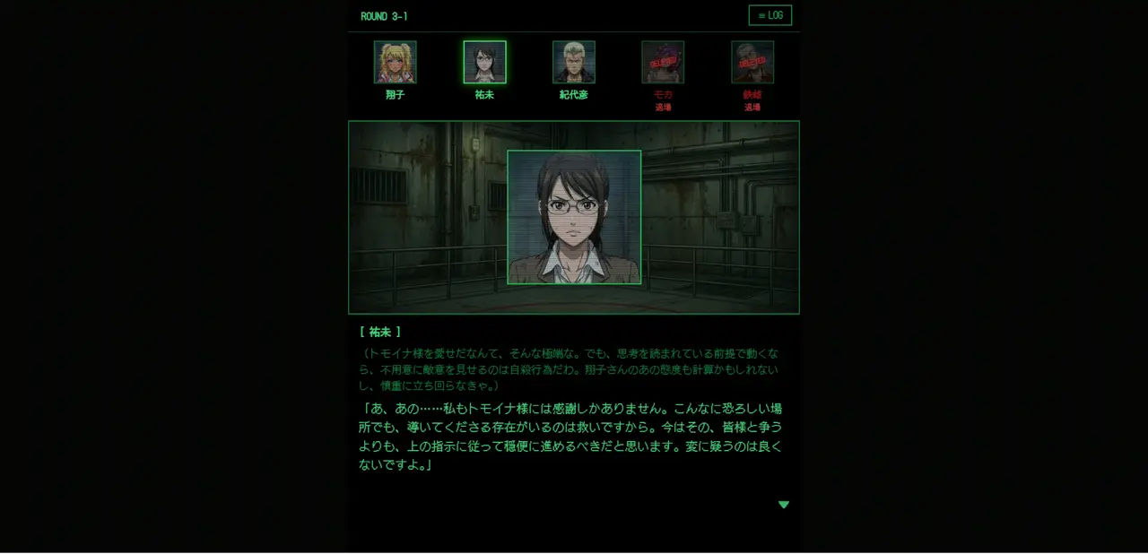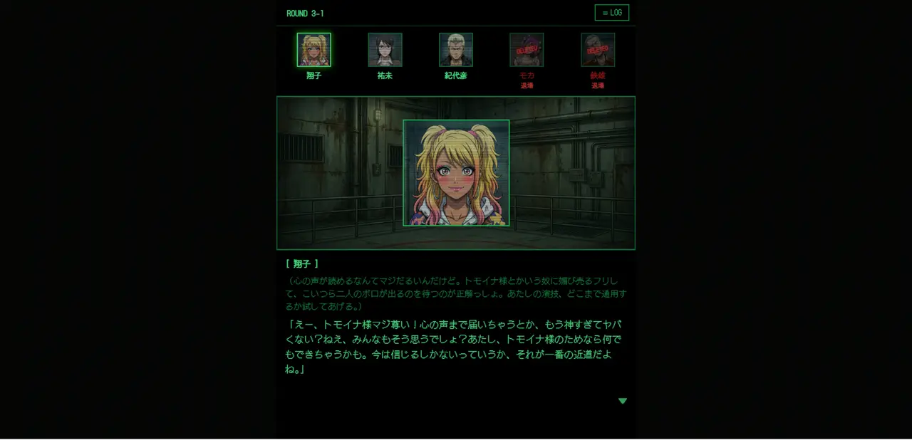 (心の声だぁ? んなもん信じられるかよ。だがGMの野郎に逆らって消されるのは御免だ。ここは一旦トモイナとかいう奴に従うフリをしつつ、この女二人が裏切らねえか見極めてやる)