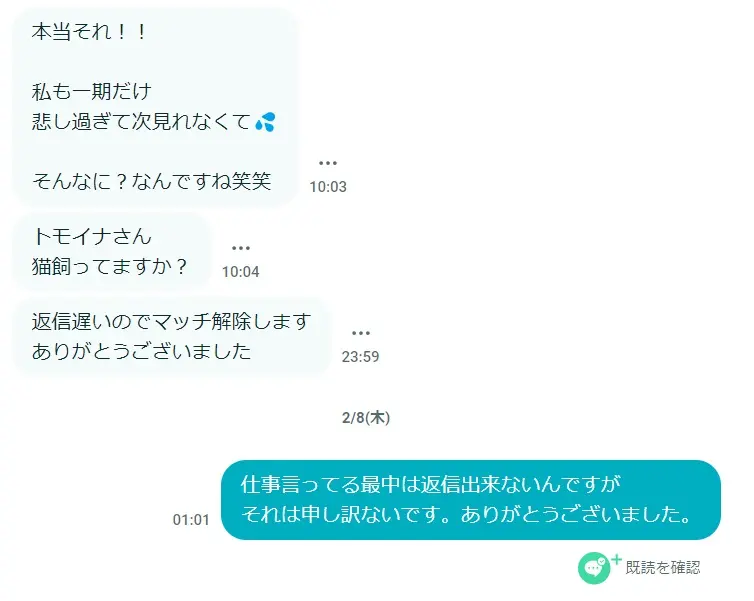 > 返信が一日遅れただけでマッチングを解除されたりした