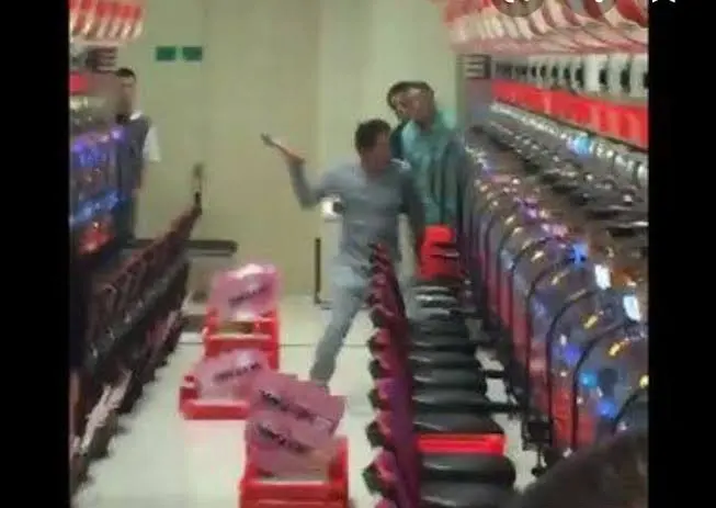 店のパチンコ台を破壊し回る、ハンマーおじさん。